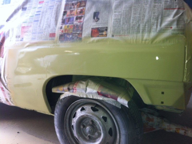 Der Linken Seitenwand ist zwar Gelb aber ich bin mit dem Ergebnis nicht zufrieden. Also muss es nochmal gemacht werden. Die Temperatur von der Dose und Raum + Auto waren leider zu niedrig, Lack hat eine Orangenhaut bekommen.