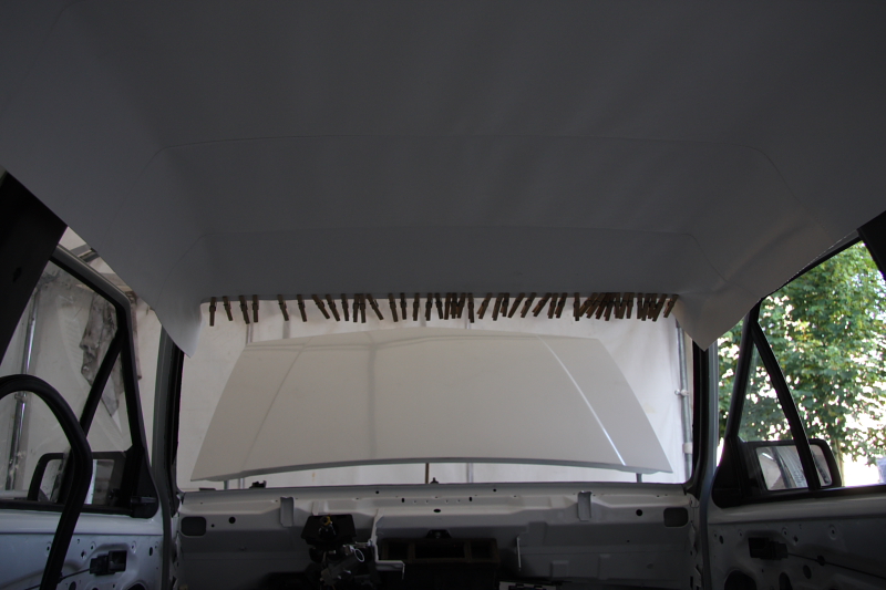 Wie dem auch sei, der neue Himmel ist ja jetzt da und wartet nur noch darauf eingebaut zu werden. Erstmal hängt er nur lose drin und mit den Wäscheklammern nur mal in Position gebracht um zu schauen ob auch alles passt. Naja die C-Säulen-Stücke sehen momentan noch etwas kurz aus. Muss ich aber nochmal schuen, vielleicht lässt sich das noch etwas ziehen. An sonsten werden die auch durch was schwarzes ersetzt.
