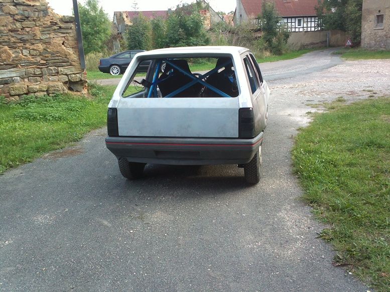 ich bin schon länger im Forum dabei, aber bisher habe ich meistens nur den Teilemarkt genutzt. Mein Name ist Jörg (86er Bj) und ich komme aus Gera (Thüringen). Schraube schon seit Jahren an Opels und habe 2011 mich für ein Corsa A Projekt mit c20xe entschieden. Nachdem mein erster Corsa Kauf ein Fehlgriff war (Karosse verzogen), habe ich im August '11 eine gute Leerkarosse (Bj 89) gekauft. Diese habe ich in Berlin-Rüdersdorf gekauft, der alte Besitzer war durch sein Corsa Taxi bekannt. Im ersten Arbeitsgang habe ich die wenigen Roststellen beseitigt und den Unterboden neu konserviert. Danach alle Karosseriearbeiten nach meinen Vorstellungen durchgeführt. Ich wollte die Optik des Vorfacelift GSI bekommen. Ich baute zusätzlich einen bösen Blick, entfernte die Schlösser, cleante die Heckklappe und arbeitete eine neue Kennzeichenmulde ein. Der Innenraum sollte sehr einfach gehalten werden, durch einen Käfig und Schalensitze. Das Armaturenbrett ist komplett entfernt und alle Bedienelemente als universelle Schalter in einer Bedieneinheit ersetzt. Als Farbe wollte ich Ardernblau vom Opc haben, jedoch versuche ich mich mit einer Selbstlackierung. Als erstes habe ich den Motorraum und den Innenraum lackiert.