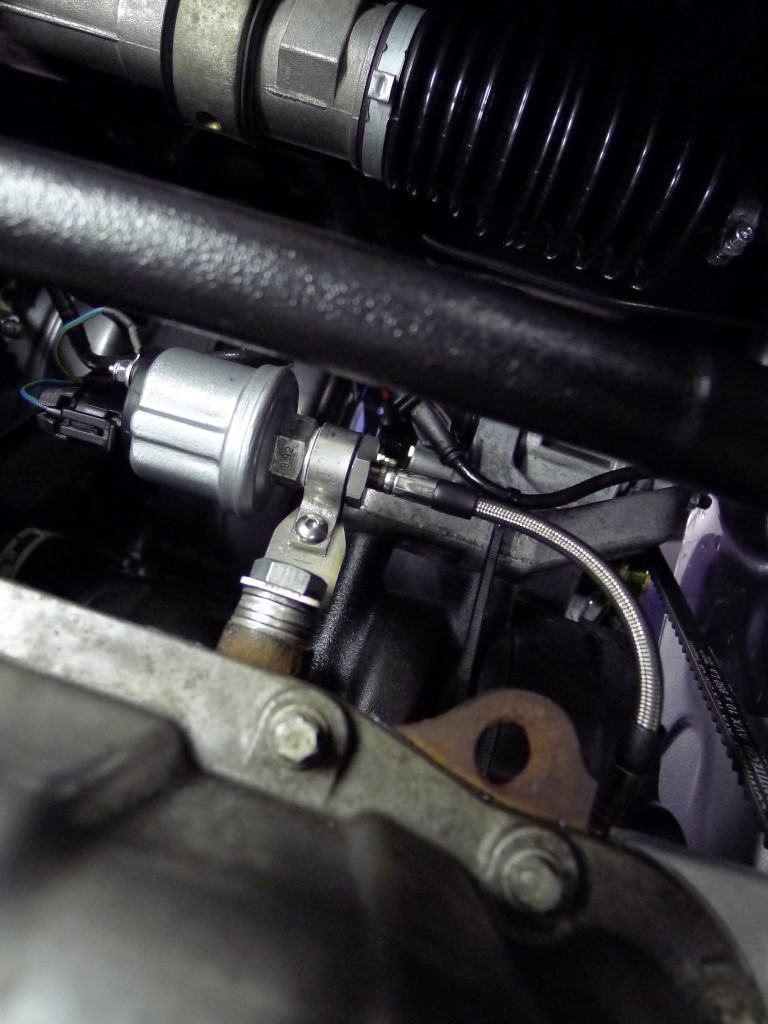 Der Motor braucht 3,8 bar Systemdruck. Außerdem hat er ein rücklauffreies System, also an der Einspritzleiste nur einen Eingang. Der Druckregler sitzt Original direkt an der Pumpe im Tank.
