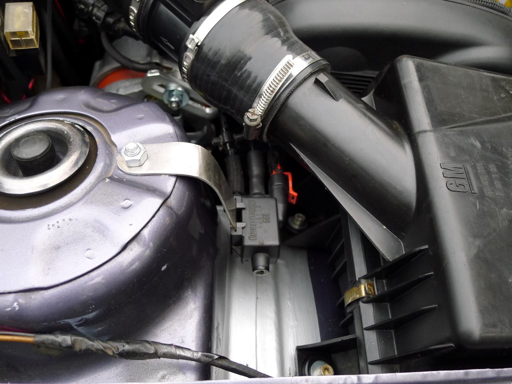 Ich suche mir also einen Platz im Motorraum, baue mir ein Halteblech, besorge ein 8-10-8 mm T-Stück und verschlauche alles. Zulauf, Rücklauf und Unterdruck. Praktischerweise war der Anschluss am BKV Rückschlagventil ohnehin frei. Den BKV Schlauch vom Vectra konnte man dank Heissluftföhn und etwas biegen übrigens auch übernehmen. Gaszug vom GSI passt 1:1.