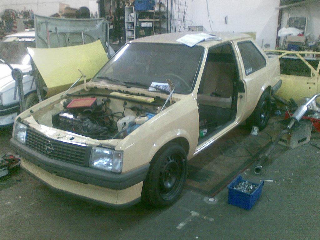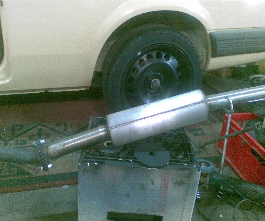 Dazu kommen 6,5x15 ET35 Stahlfelgen. Orig. Stoßstangen vorn u. hi. und ne VF GL Ausstattung aus nem 87er CC. Motor ist ein C16NZ mit GSi Welle, 1,8er DK Und GSi-Hosenrohr mit Astra C16SE-Krümmer. Dazu noch das C3,74er Getriebe von meinem. Sollte schon ein bischen vorwärts fahren. Für den Auspuff habe ich mir einen neuen Kompensator gekauft, sodaß ich den NZ-Kat weiterverwenden konnte. MSD ist von FOX mit 50er Durchmesser. Da beim Kauf kein Anschlussstück zum Kat mit dabei war, musste ich ebenfalls selber was bauen. Scheibenfolie ist von Foliatec mit 35% Durchlass. Passt ein wenig zur vorderen Colorverglasung. Werbung darf natürlich auch nicht fehlen :D :top: .