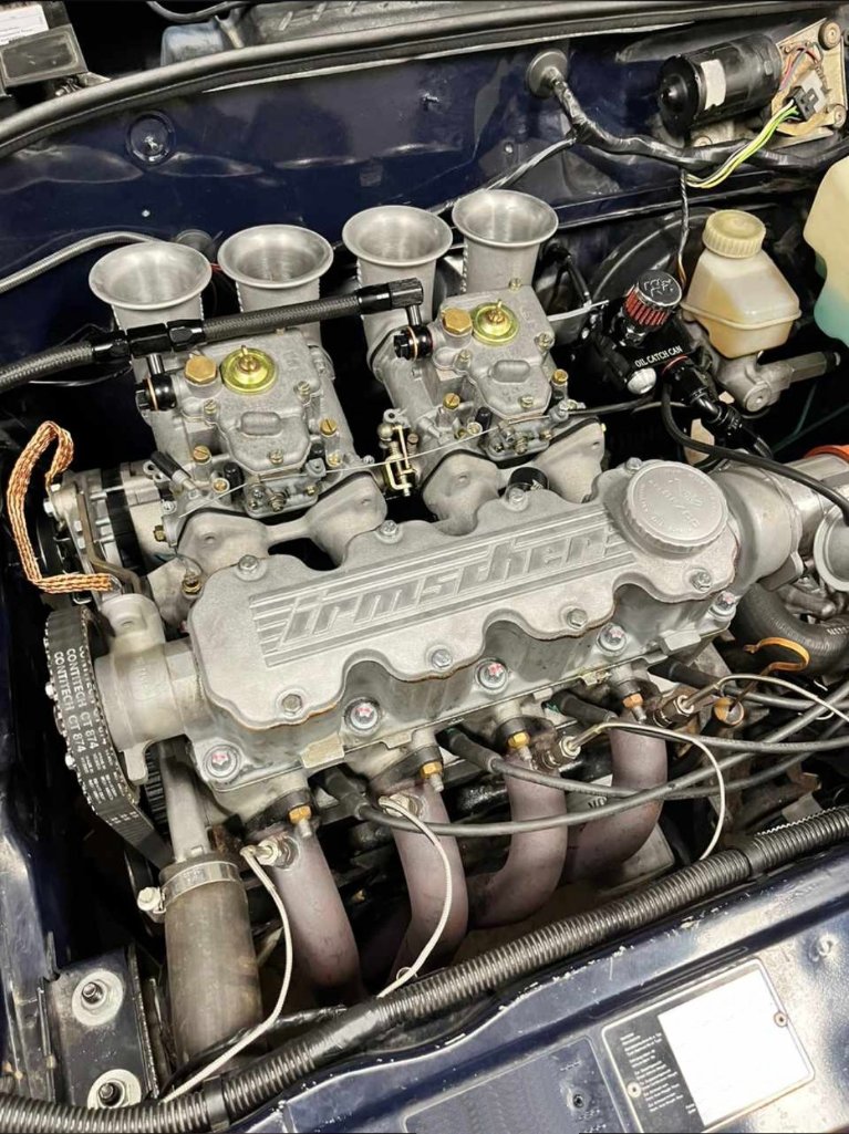 Er hat jetzt einen E16SE mit Weber Flachstromvergasern (40er) und Irmscher Ansaugtrichtern, Kontaktzündung (1,3er), Sportnockenwelle (272°) mit verstellbarem Nockenwellenrad, 4 in 1 Fächerkrümmer und noch ein paar anderen Sachen auf die ich nicht weiter eingehen werde.