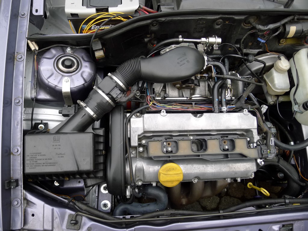 Ich suche mir also einen Platz im Motorraum, baue mir ein Halteblech, besorge ein 8-10-8 mm T-Stück und verschlauche alles. Zulauf, Rücklauf und Unterdruck. Praktischerweise war der Anschluss am BKV Rückschlagventil ohnehin frei. Den BKV Schlauch vom Vectra konnte man dank Heissluftföhn und etwas biegen übrigens auch übernehmen. Gaszug vom GSI passt 1:1.