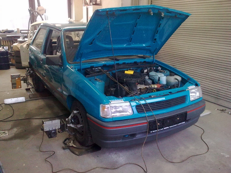 Heut noch die Spur vermessen, Lenkrad stand nicht ganz gerade und Fahrerseitig war die Spurstange hinüber, das hatte ich letztes Jahr übersehen. Anbei mal ein Bild von unseren historischen Vermessungsanlage, Anno 1850. Das dauert schon mal ne Dreiviertelstunde eh der Mist aufgebaut und ausgerichtet ist. Nun steht das Lenkrad aber gerade und er läuft einwandfrei gerade aus.