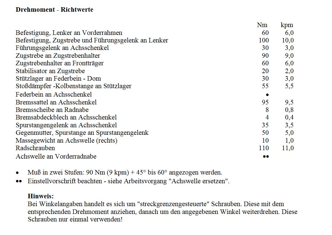Hier mal ein Überblick über den Zusammenbau der Vorderachse mit den dazugehörigen Arbeitswerten