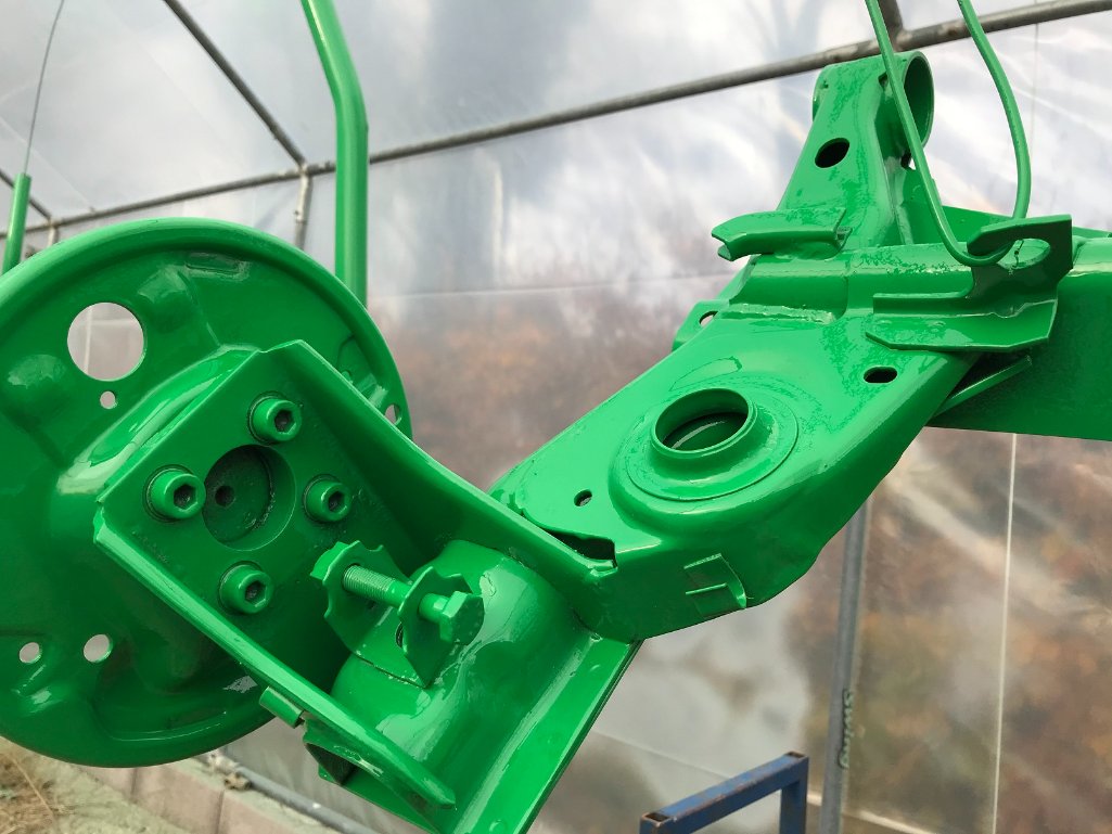 Nachdem alles fertig grundiert, gefüllert und geschliffen war, haben wir alle Teile nochmal ordentlich gereinigt und entfettet um dann endlich zu lackieren. Diesen Job hat mein Kumpel Nanoukh übernommen. (Danke für Deine Unterstützung!) Zuerst wurden die Anbauteile mit 2K Basislack in Reingrün lackiert. Anschließend die Karosserie. Das Ergebnis war für eine Garagenlackierung sehr gut geworden. Als nächstes kam noch eine Schicht Klarlack drüber. Das hat nicht so gut funktioniert, es gab ein paar Läufer und auch etwas Orangenhaut. Mit schleifen und polieren konnte man aber noch einiges wieder rausholen. Ich war begeistert wie schön sauber und gleichmäßig jetzt alles aussah. Ich konnte es nun nicht mehr abwarten mit dem Zusammenbau anzufangen.