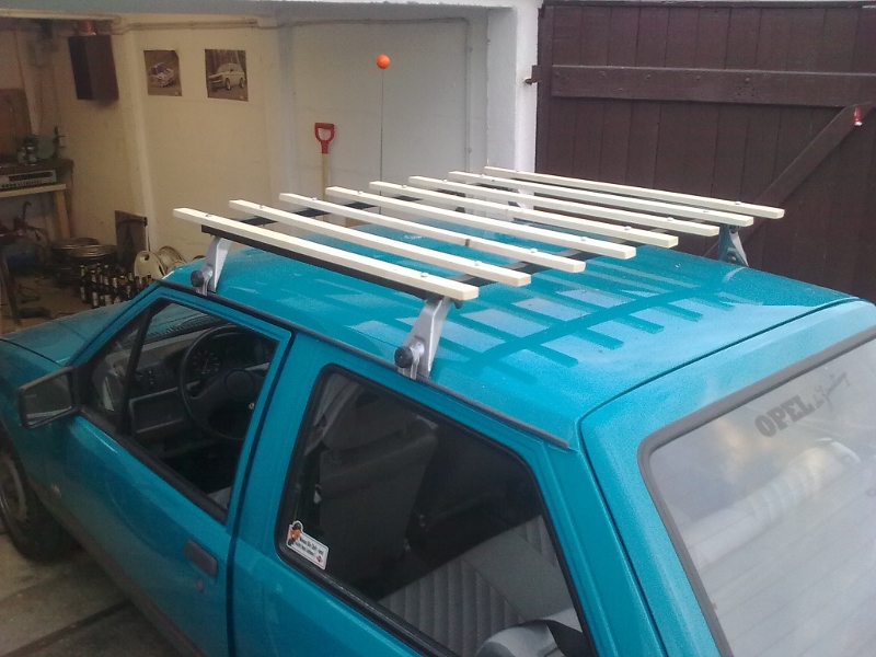 Desweiteren hab ich mir nen Dachgepäckträger gebastelt. Gestern geschweißt, heute die Lattung und Dekogelump drauf gemacht. Morgen werden die Latten noch dunkel lasiert. Bis dass die grün-weißen Kollegen mich anhalten...Muss ja bestimmt auch eingetragen sein der Mist.