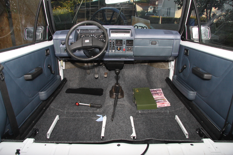 Bei mir gings die Tage auch weiter. Die Innenausstattung ist fast komplett, fehlen nur noch die hinteren Gurte undder Fahrersitz, dann wäre das Kapitel auch erledigt. Hab jetzt die eine Seitenverkleidung mit den Klips für die Kofferraumseitenteile befestigt. Ist zwar nicht original, aber hebt gerade so gut